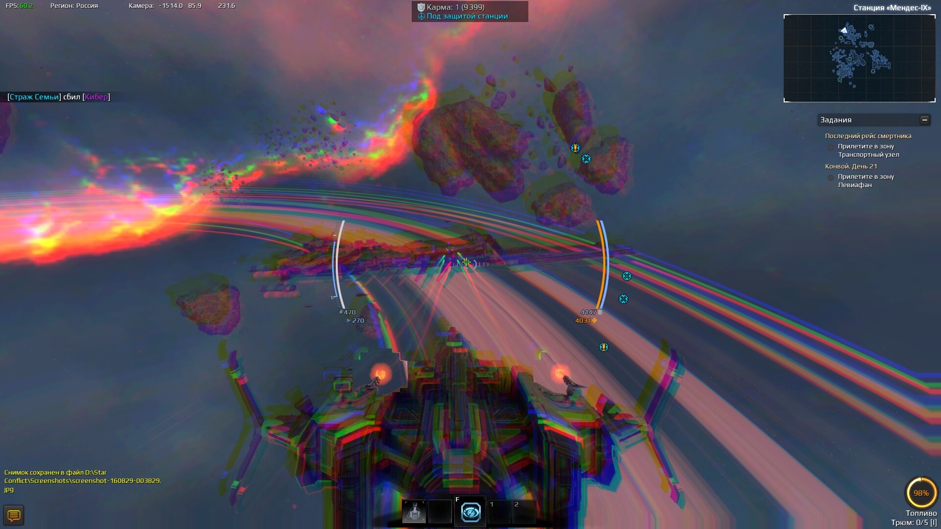 При вылете в космос, изображение всего, что связано с 3D двоится, интерфейс в норме. В Анграе всё изображение тоже в норме.