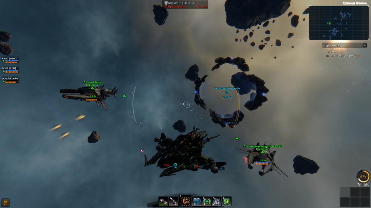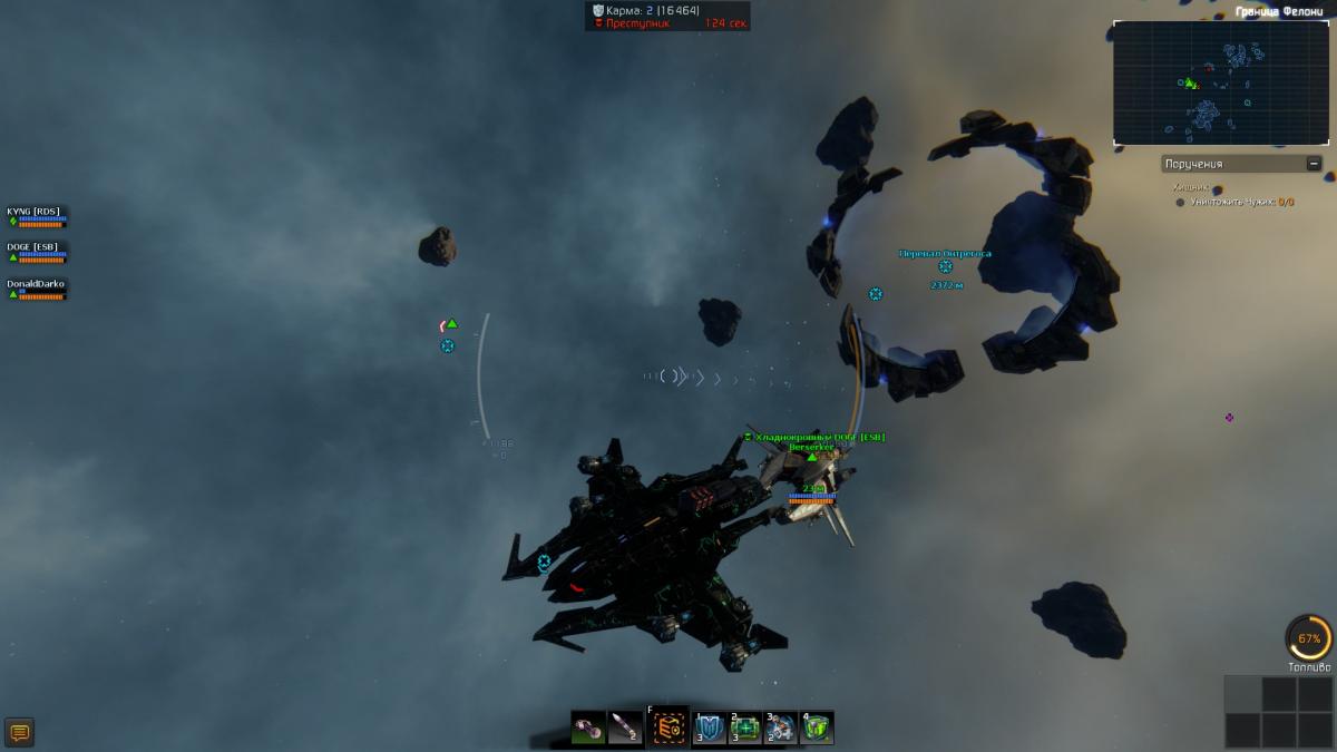 Зачистив и эту локацию, уже втроем мы полетели вновь в Фелони, нам сообщили там наплыв обмазанных. Там то мы и встретили DOGE, который храбро боролся с ними. Взяв его в нашу компанию, мы (не поверите) всё зачистили, и полетели (не поверите) в Бартерную зону!