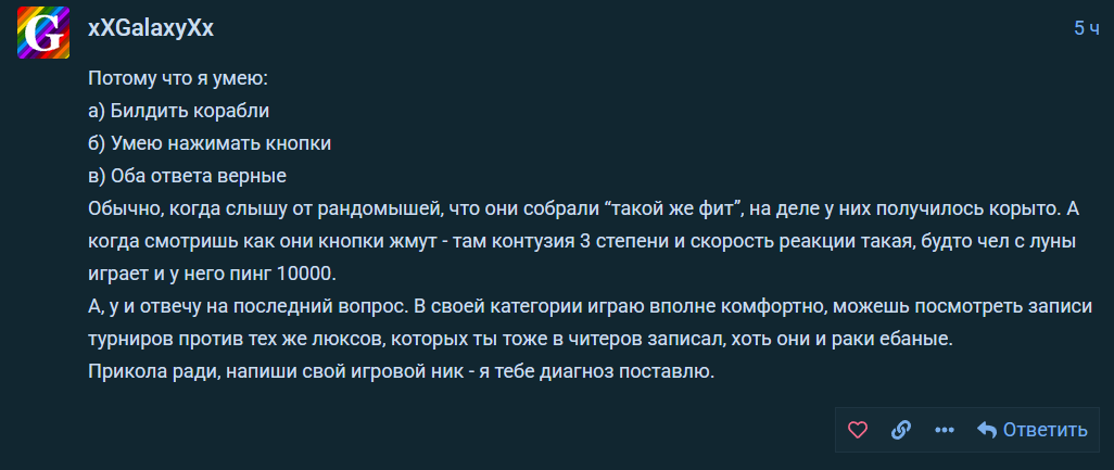 “Да, я не хочу как-то делать сетап, но если мой один любимый корабль убивает специально заточенный исключительно под убийство не имеющих сейвов брёвен - я пойду плакаться”.