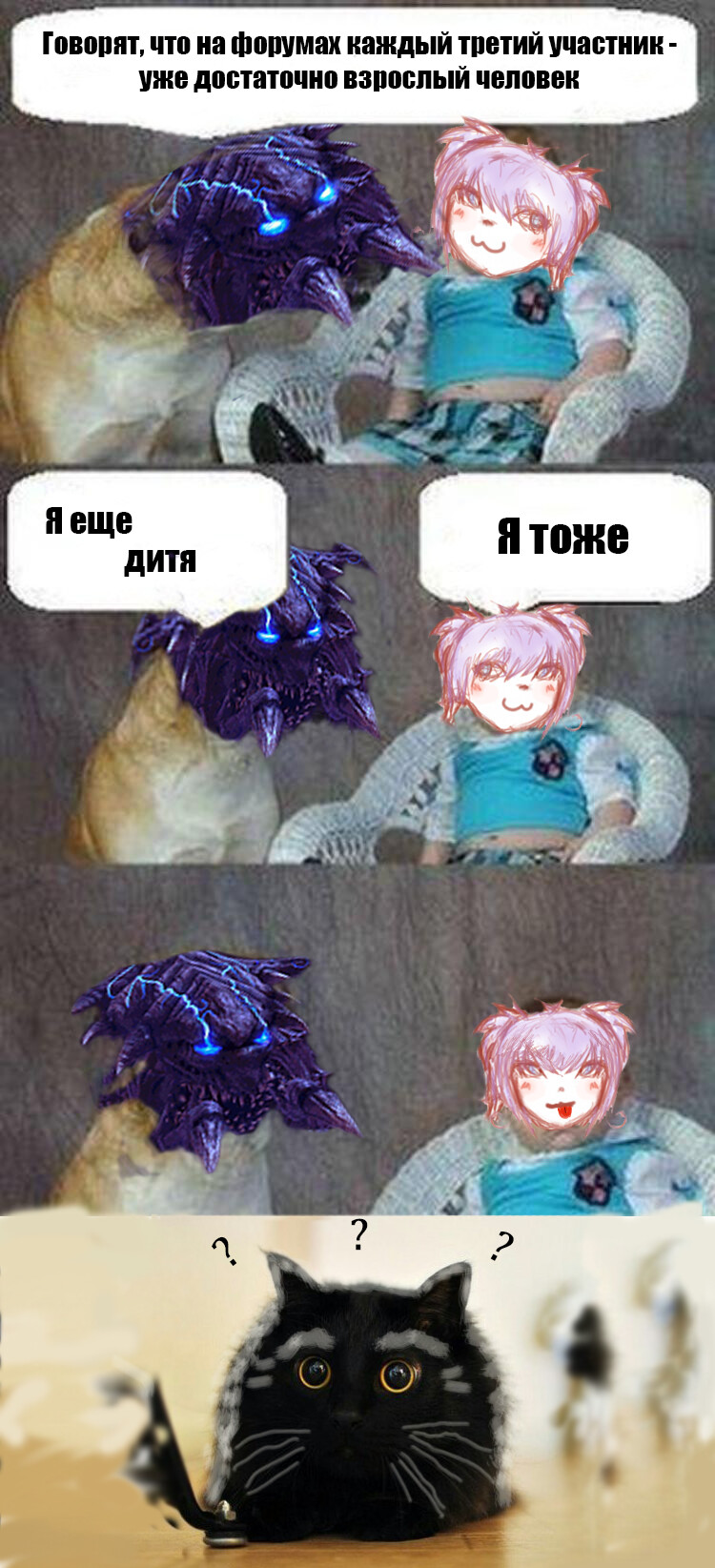 Постойте ка… Кот признался в том, что он дитя ? Попался!!! *бреет Коту хвост* Трича, не тормози, печь разогревай!