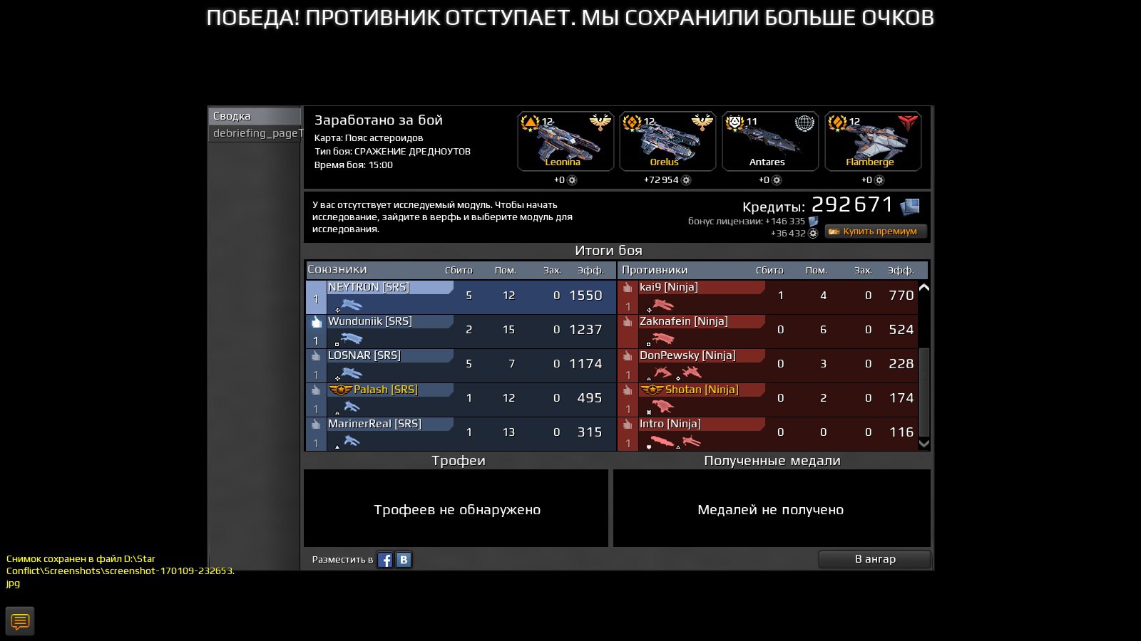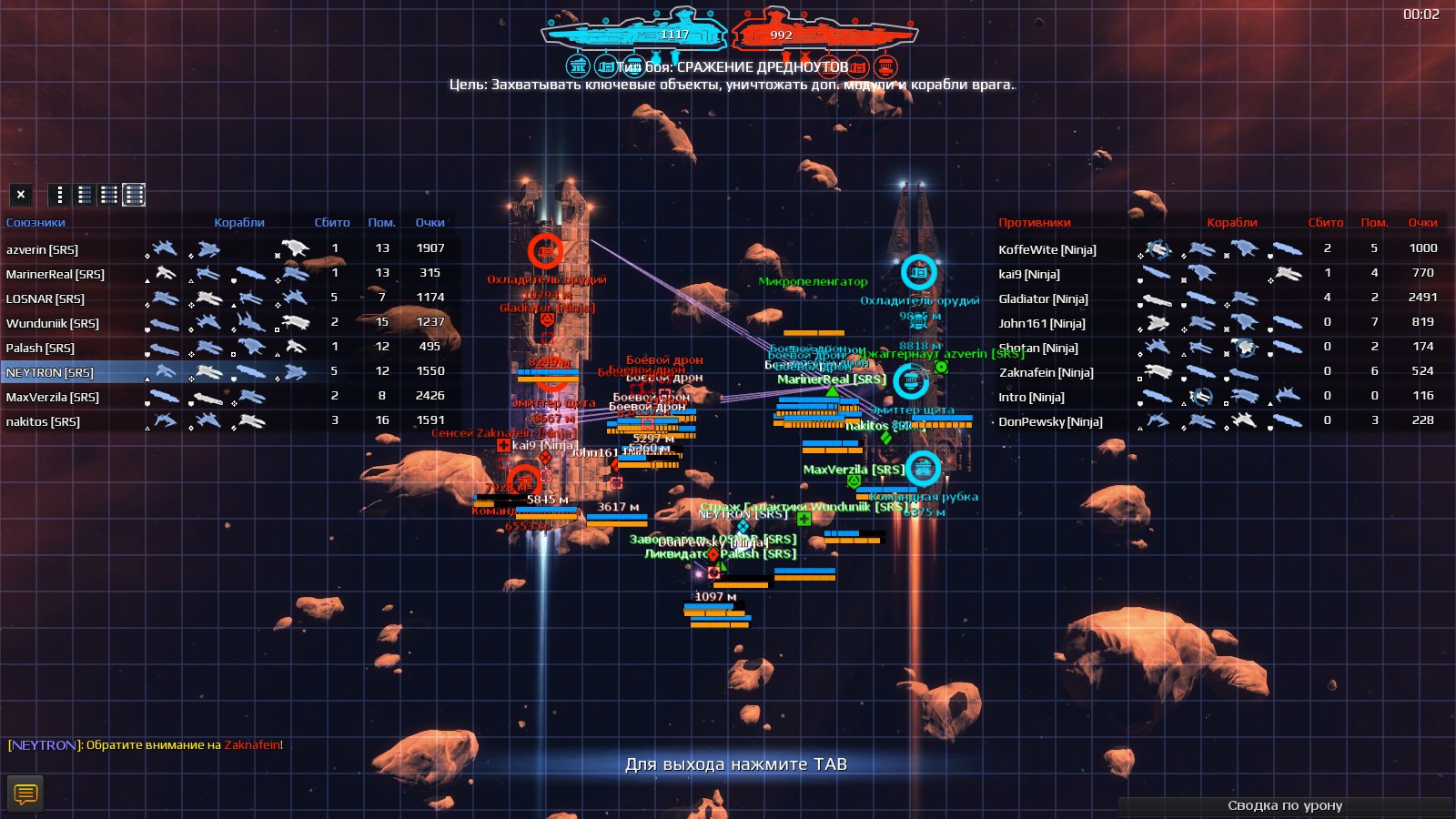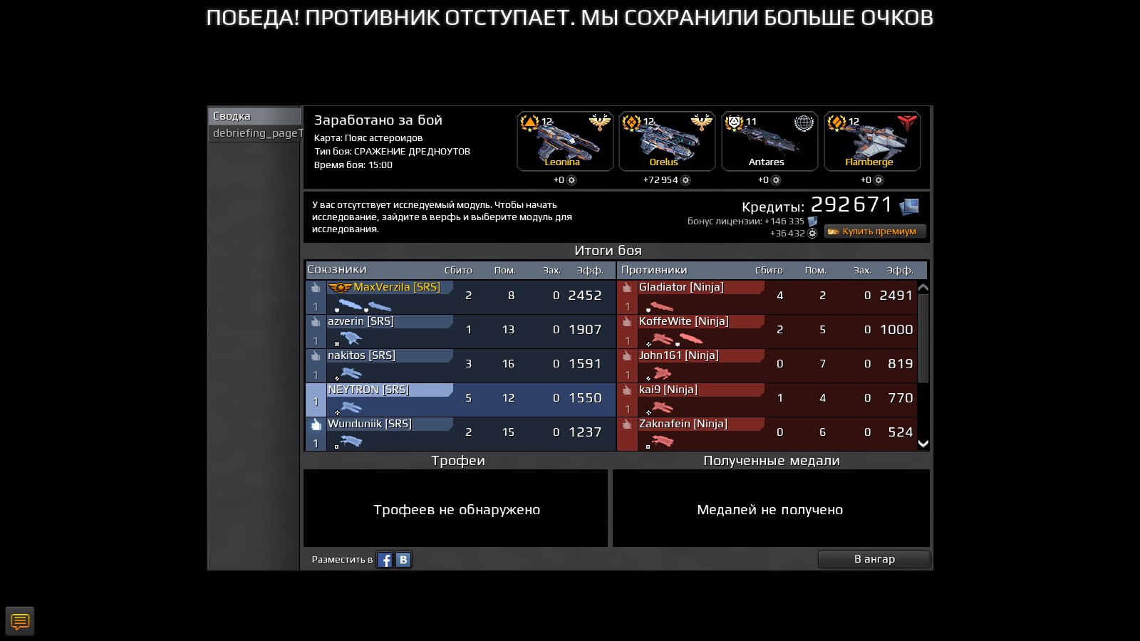 А вот бой на т4, имперский дред против йерихонского, СРС (8 срс) против Ниньзей (8 ниньзей), СРС выигрывают на 100 очков и бинго, смотрим по килам