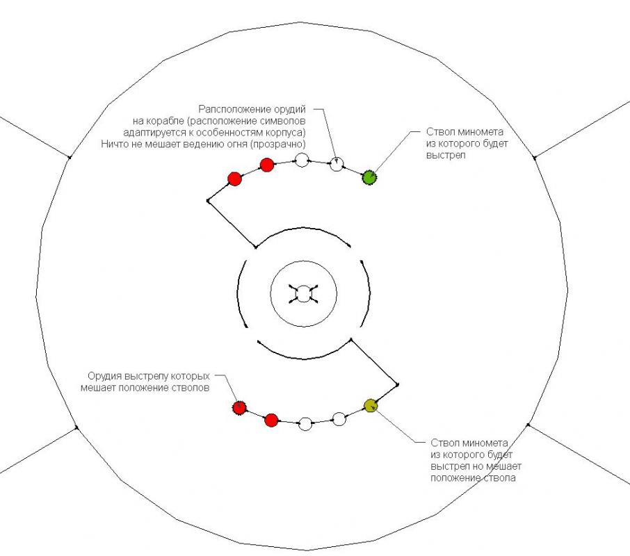 Внутренний элемент, соединенный перемычкой с индикаторами отображает принадлежность группы орудий (палубные, дно, левые или правые двигатель, крыло)